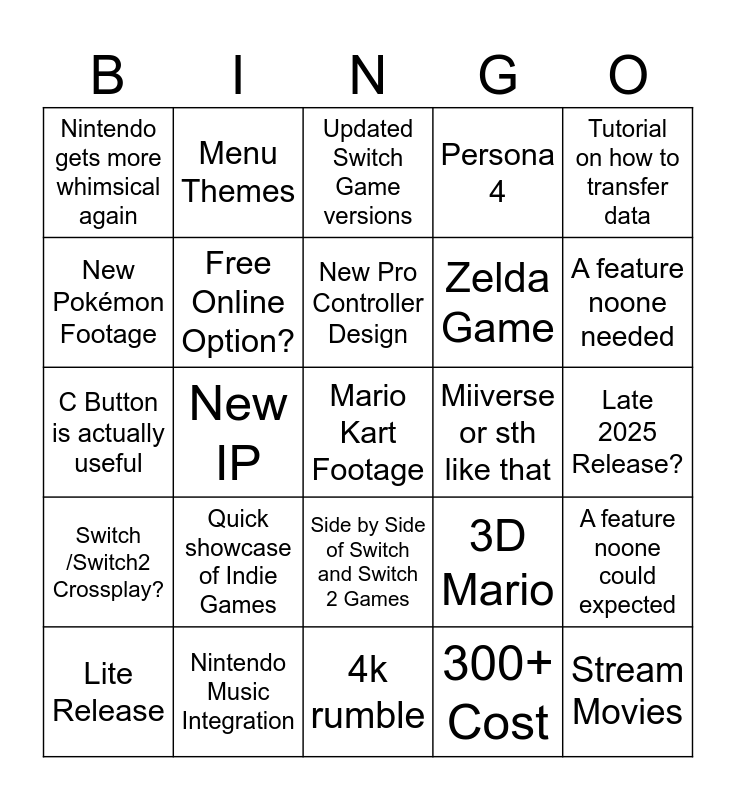 This bingo card has a free space and 24 words: Quick showcase of Indie Games, Nintendo Music Integration, New Pro Controller Design, Lite Release, Tutorial on how to transfer data, Nintendo gets more whimsical again, New Pokémon Footage, Menu Themes, Miiverse or sth like that, Side by Side of Switch and Switch 2 Games, Zelda Game, C Button is actually useful, 3D Mario, A feature noone could expected, Free Online Option?, 300+ Cost, Late 2025 Release?, Updated Switch Game versions, A feature noone needed, New IP, Stream Movies, Switch /Switch2 Crossplay?, Persona 4 and 4k rumble.