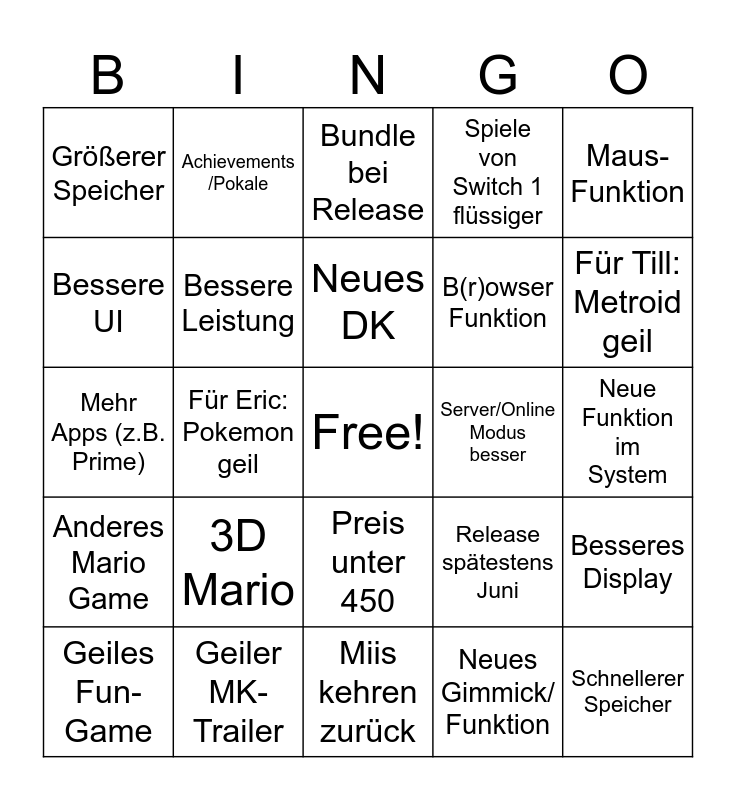 This bingo card has a free space and 24 words: 3D Mario, Geiler MK-Trailer, Neues DK, Geiles Fun-Game, Maus-Funktion, Größerer Speicher, Bessere UI, Achievements /Pokale, Server/Online Modus besser, Preis unter 450, B(r)owser Funktion, Mehr Apps (z.B. Prime), Release spätestens Juni, Besseres Display, Bessere Leistung, Neues Gimmick/ Funktion, Neue Funktion im System, Bundle bei Release, Für Till: Metroid geil, Für Eric: Pokemon geil, Schnellerer Speicher, Anderes Mario Game, Spiele von Switch 1 flüssiger and Miis kehren zurück.