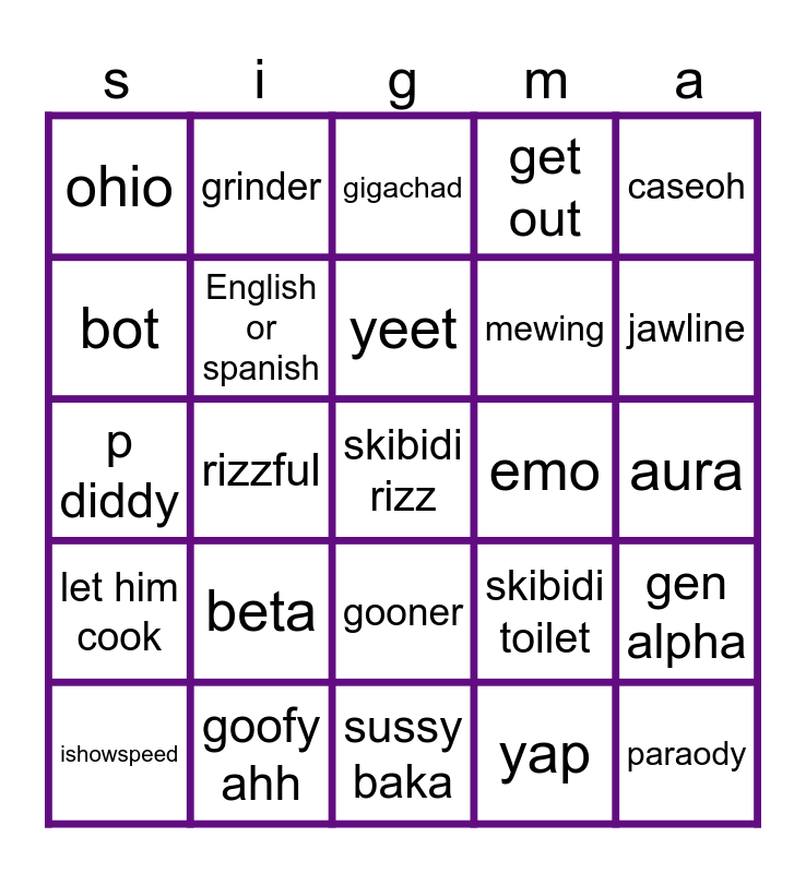 This bingo card has a free space and 24 words: beta, goofy ahh, yeet, ishowspeed, caseoh, ohio, bot, grinder, emo, gooner, mewing, p diddy, skibidi toilet, gen alpha, English or spanish, yap, aura, gigachad, jawline, rizzful, paraody, let him cook, get out and sussy baka.
