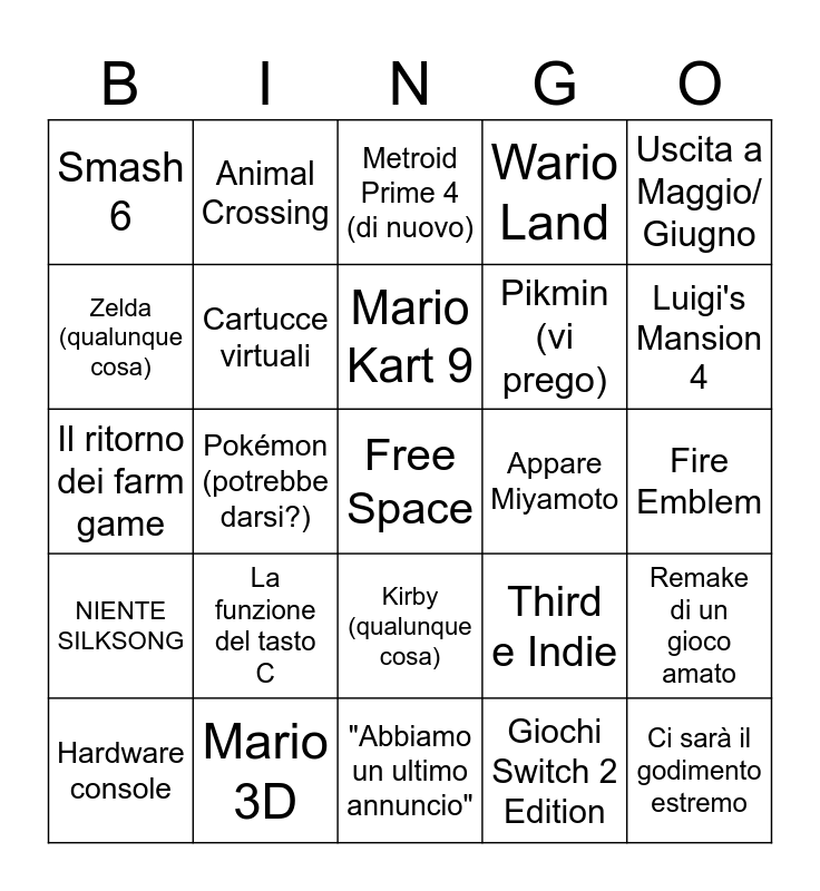 This bingo card has a free space and 24 words: La funzione del tasto C, Mario 3D, Mario Kart 9, Hardware console, Uscita a Maggio/ Giugno, Smash 6, Zelda (qualunque cosa), Animal Crossing, Appare Miyamoto, Kirby (qualunque cosa), Pikmin (vi prego), Il ritorno dei farm game, Third e Indie, Remake di un gioco amato, Cartucce virtuali, Giochi Switch 2 Edition, Fire Emblem, Metroid Prime 4 (di nuovo), Luigi's Mansion 4, Pokémon (potrebbe darsi?), Ci sarà il godimento estremo, NIENTE SILKSONG, Wario Land and "Abbiamo un ultimo annuncio".