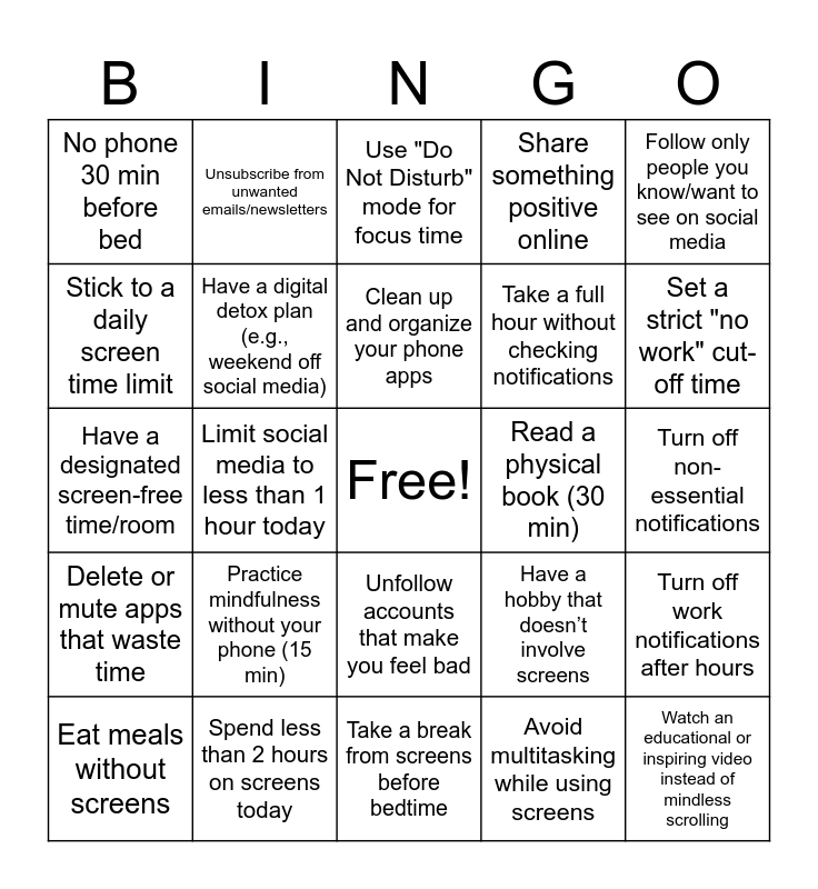 This bingo card has a free space and 24 words: Practice mindfulness without your phone (15 min), Spend less than 2 hours on screens today, Clean up and organize your phone apps, Eat meals without screens, Follow only people you know/want to see on social media, No phone 30 min before bed, Stick to a daily screen time limit, Unsubscribe from unwanted emails/newsletters, Read a physical book (30 min), Unfollow accounts that make you feel bad, Take a full hour without checking notifications, Have a designated screen-free time/room, Have a hobby that doesn’t involve screens, Turn off work notifications after hours, Have a digital detox plan (e.g., weekend off social media), Avoid multitasking while using screens, Turn off non-essential notifications, Use "Do Not Disturb" mode for focus time, Set a strict "no work" cut-off time, Limit social media to less than 1 hour today, Watch an educational or inspiring video instead of mindless scrolling, Delete or mute apps that waste time, Share something positive online and Take a break from screens before bedtime.