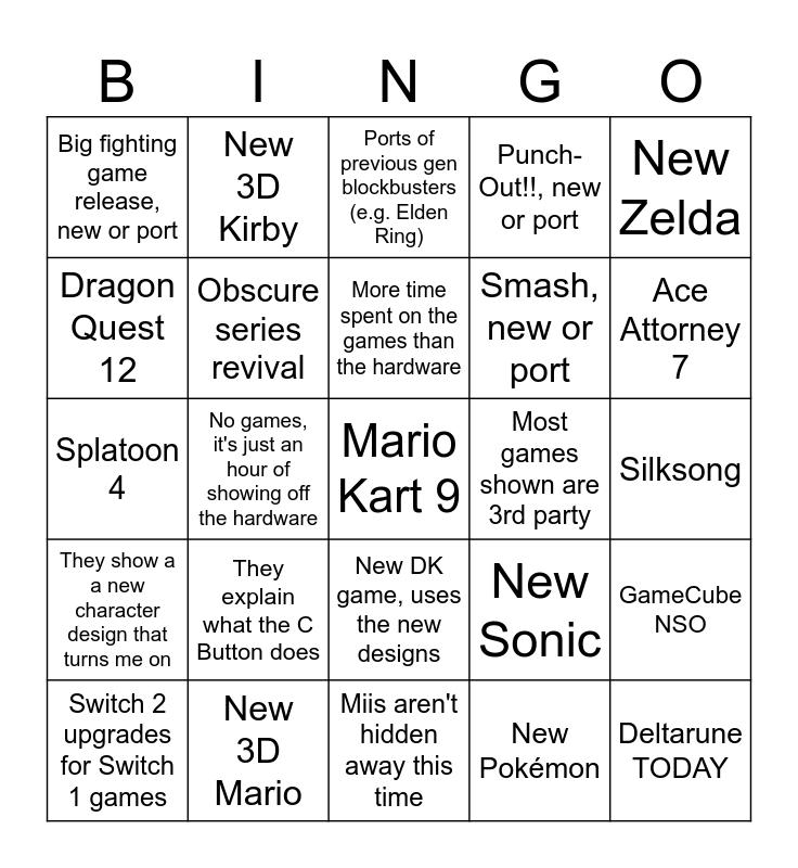 This bingo card has a free space and 24 words: They explain what the C Button does, New 3D Mario, More time spent on the games than the hardware, Switch 2 upgrades for Switch 1 games, New Zelda, Big fighting game release, new or port, Dragon Quest 12, New 3D Kirby, Most games shown are 3rd party, New DK game, uses the new designs, Smash, new or port, Splatoon 4, New Sonic, GameCube NSO, Obscure series revival, New Pokémon, Silksong, Ports of previous gen blockbusters (e.g. Elden Ring), Ace Attorney 7, No games, it's just an hour of showing off the hardware, Deltarune TODAY, They show a a new character design that turns me on, Punch-Out!!, new or port and Miis aren't hidden away this time.