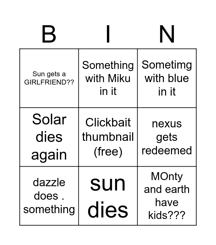 This bingo card has a free space and 8 words: nexus gets redeemed, Sometimg with blue in it, Something with Miku in it, dazzle does . something, Sun gets a GIRLFRIEND??, MOnty and earth have kids???, Solar dies again and sun dies.