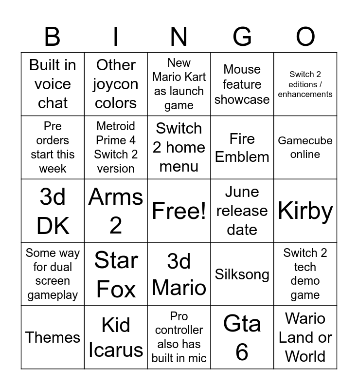 This bingo card has a free space and 24 words: Star Fox, Kid Icarus, Switch 2 home menu, Themes, Switch 2 editions / enhancements, Built in voice chat, Pre orders start this week, Other joycon colors, June release date, 3d Mario, Fire Emblem, 3d DK, Silksong, Switch 2 tech demo game, Metroid Prime 4 Switch 2 version, Gta 6, Kirby, New Mario Kart as launch game, Gamecube online, Arms 2, Wario Land or World, Some way for dual screen gameplay, Mouse feature showcase and Pro controller also has built in mic.