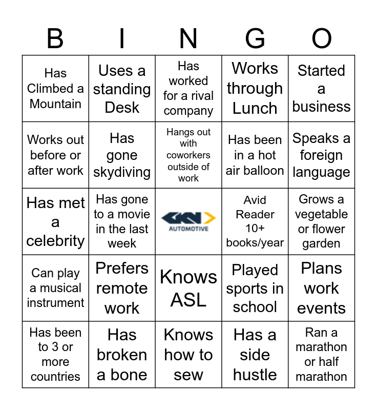 This bingo card has a free space and 29 words: Has been to 3 or more countries, Lives in a City, Has gone to a movie in the last week, Worked at GKN more than 5 Years, Has Climbed a Mountain, Has worked for a rival company, Has gone skydiving, Prefers remote work, Avid Reader 10+ books/year, Has broken a bone, Grows a vegetable or flower garden, Ran a marathon or half marathon, Knows how to sew, Has a side hustle, Speaks a foreign language, Likes Spicy Foods, Knows ASL, Can play a musical instrument, Started a business, Has met a celebrity, Played sports in school, Has taken a cruise, Has been in a hot air balloon, Works out before or after work, Works through Lunch, Uses a standing Desk, Plans work events, Hangs out with coworkers outside of work and First WLC with GKN.