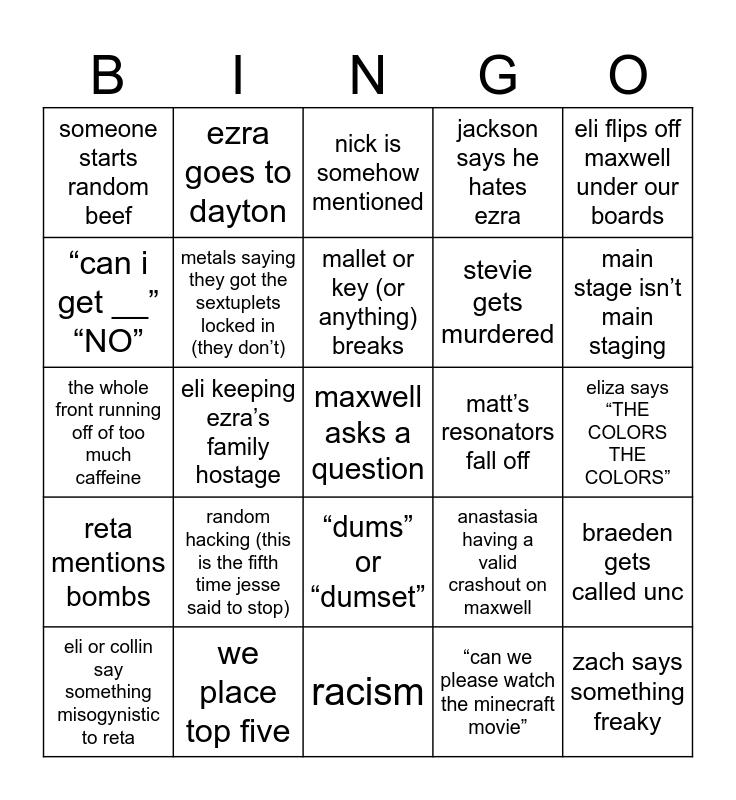 This bingo card has a free space and 24 words: random hacking (this is the fifth time jesse said to stop), we place top five, mallet or key (or anything) breaks, eli or collin say something misogynistic to reta, eli flips off maxwell under our boards, someone starts random beef, “can i get __” “NO”, ezra goes to dayton, matt’s resonators fall off, “dums” or “dumset”, stevie gets murdered, the whole front running off of too much caffeine, anastasia having a valid crashout on maxwell, braeden gets called unc, metals saying they got the sextuplets locked in (they don’t), “can we please watch the minecraft movie”, eliza says “THE COLORS THE COLORS”, nick is somehow mentioned, main stage isn’t main staging, eli keeping ezra’s family hostage, zach says something freaky, reta mentions bombs, jackson says he hates ezra and racism.