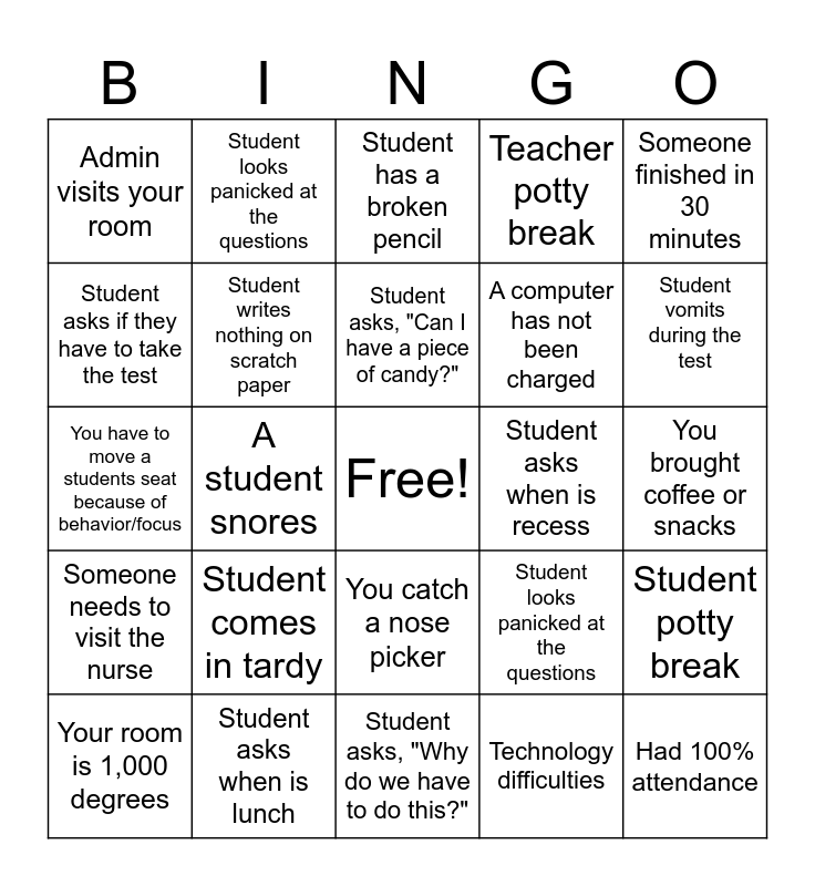 This bingo card has a free space and 70 words: Student needs water, You brought coffee or snacks, Your room is freezing, The same student asks more than 5 questions, Student asks when is lunch, A student asks a question about the test, Teacher potty break, Student falls asleep, Someone finished in 30 minutes, Same kid tries to leave the room 3 times, Student potty break, Student announces the test was easy, Admin visits your room, Student has a broken pencil, You forgot your coffee or snacks, A student snores, You catch a nose picker, A computer has not been charged, Technology difficulties, Someone needs to visit the nurse, Student asks when is recess, Student looks panicked at the questions, Student vomits during the test, Student asks if this test counts, Student has 50% of the test left after 2 hours, Student finishes the test in 15 minutes, Student asks when is recess, You forgot your coffee or snacks, Technology difficulties, Student asks when is lunch, Student looks panicked at the questions, Student asks if this test counts, Student needs water, Student comes to you to let you know they are finished, A computer has not been charged, Student asks “how many questions”, At least one pair of headphones doesn’t work, Student needs help logging in, You have to call for assistance, Student asks if they have to take the test, Wifi Issues, Student comes in tardy, Had 100% attendance, Can't locate the hall monitor, Student has broken computer, Student writes nothing on scratch paper, Your room is 1,000 degrees, Student asks to sharpen a pencil, Students yelling in the hallway, Headphones not plugged in, Student asks if they can have a snack, Test not loading, Student farts or burps during testing, Student asks, "Can I play a game on my computer when I finish?", Student asks, "Why do we have to do this?", Student blows their nose, Student asks, "Can I have a piece of candy?", Students asks about the test questions that you cannot answer, Water bottle falls to the floor, Student asks what to do when they are finished, You have to move a students seat because of behavior/focus, Student tries to leave the room 3 times, Student asks to get their bookbag, Student writes or draws on their test ticket, Student staring out the window, Student asks when they will know their score, Student says, "I don't get this", Student asks "Are you sure you covered this?", Students silently communicates with each other after testing and Student does not read the passage and just goes to the questions.