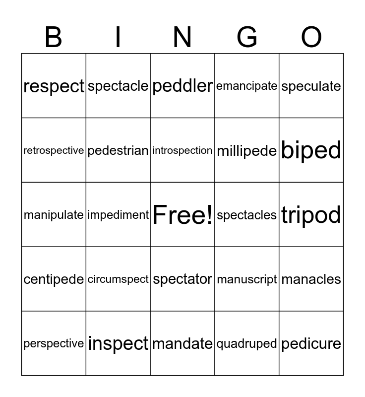 This bingo card has a free space and 24 words: circumspect, inspect, introspection, perspective, speculate, respect, retrospective, spectacle, spectacles, spectator, millipede, manipulate, manuscript, manacles, pedestrian, quadruped, tripod, peddler, biped, impediment, pedicure, centipede, emancipate and mandate.