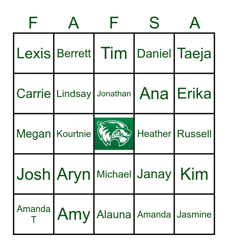 This bingo card has a free space and 36 words: Angela, Dana, Gabriella, Lindsay, Janay, Josh, Jonathan, Damian, Taeja, Katie, Kourtnie, Daniel, Sarah, Heather, Erika, Lexis, Kragun, Aryn, Jasmine, Tim, Russell, Kim, Amy, Amanda T, Alauna, Berrett, Megan, Sheila, Ana, Carrie, Meta, Jenice, Amanda, Michael, Scott and Tyler.