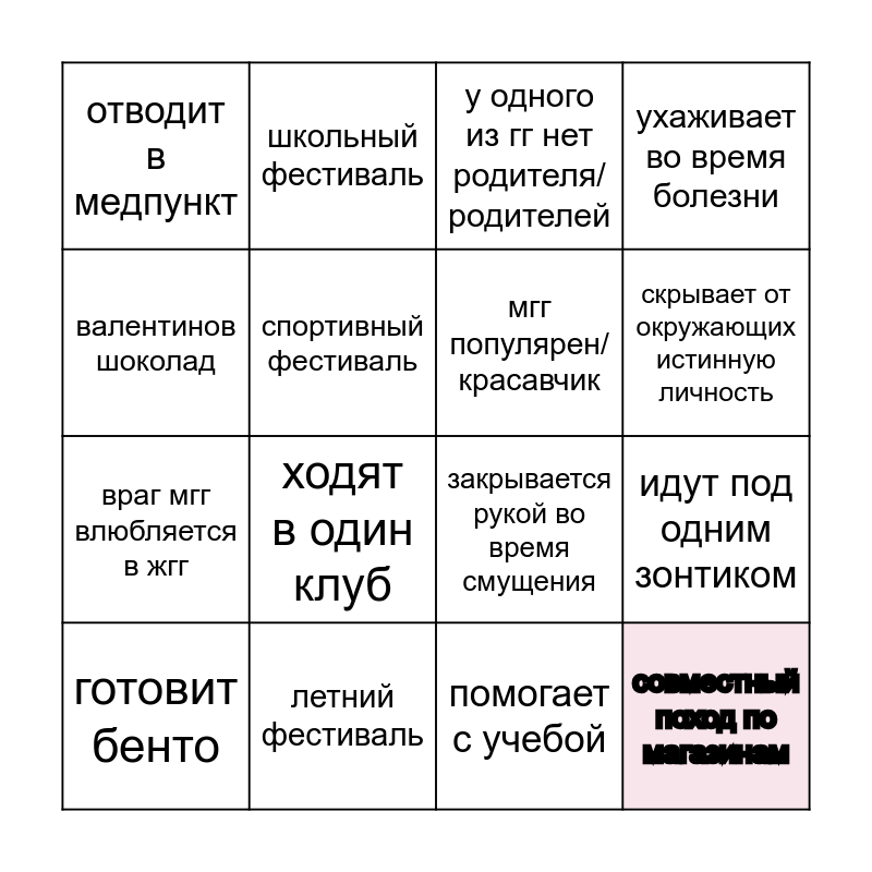 This bingo card has 16 words: готовит бенто, летний фестиваль, у одного из гг нет родителя/родителей, ухаживает во время болезни, валентинов шоколад, школьный фестиваль, закрывается рукой во время смущения, идут под одним зонтиком, отводит в медпункт, спортивный фестиваль, помогает с учебой, скрывает от окружающих истинную личность, враг мгг влюбляется в жгг, ходят в один клуб, мгг популярен/красавчик and совместный поход по магазинам.