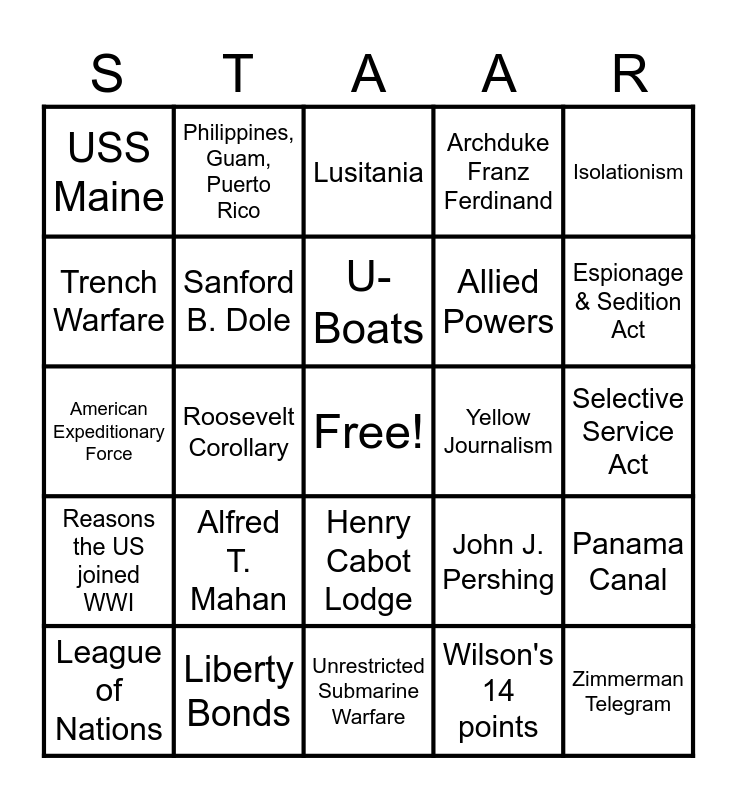 STAAR REVIEW BINGO-Imperialism/WWI | World War I | US History Midterm | Spanish American Warl/World War I | World War 1