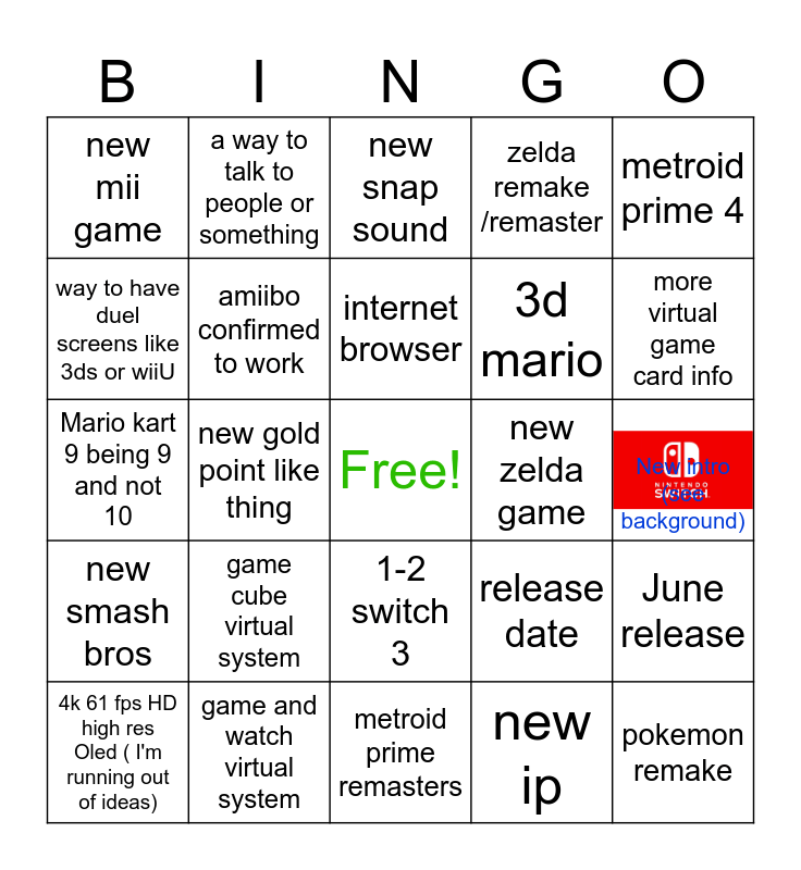 This bingo card has 1 images, a free space and 24 words: game cube virtual system, game and watch virtual system, internet browser, 4k 61 fps HD high res Oled ( I'm running out of ideas), metroid prime 4, new mii game, way to have duel screens like 3ds or wiiU, a way to talk to people or something, new zelda game, 1-2 switch 3, 3d mario, Mario kart 9 being 9 and not 10, release date, June release, amiibo confirmed to work, new ip, New intro (see background), new snap sound, more virtual game card info, new gold point like thing, pokemon remake, new smash bros, zelda remake /remaster and metroid prime remasters.