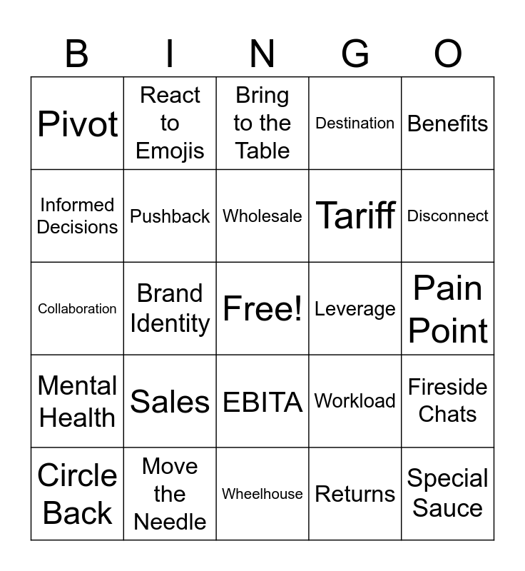 This bingo card has a free space and 29 words: Circle Back, Bandwidth, Brand Identity, Year over Year, Pivot, Bring to the Table, Pushback, Sales, Leverage, Move the Needle, Pain Point, Special Sauce, Wheelhouse, Returns, Disconnect, #Lucrew, EBITA, Mental Health, Benefits, Collaboration, Workload, All Hands on Deck, Tariff, Informed Decisions, Destination, React to Emojis, Fireside Chats, Wholesale and Bottomline.