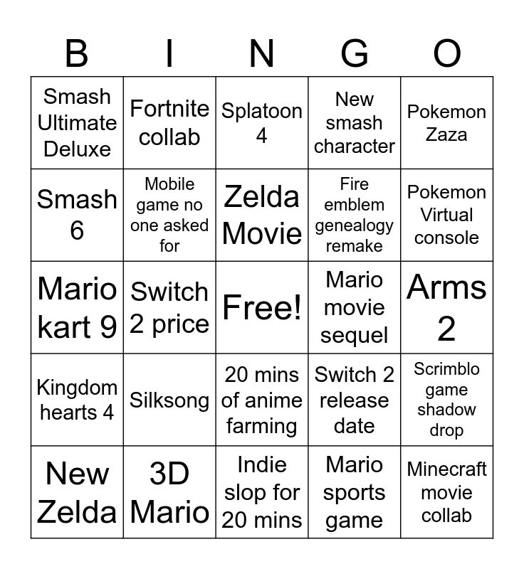 This bingo card has a free space and 24 words: Silksong, 3D Mario, Zelda Movie, New Zelda, Pokemon Zaza, Smash Ultimate Deluxe, Smash 6, Fortnite collab, Mario movie sequel, 20 mins of anime farming, Fire emblem genealogy remake, Mario kart 9, Switch 2 release date, Scrimblo game shadow drop, Mobile game no one asked for, Mario sports game, Arms 2, Splatoon 4, Pokemon Virtual console, Switch 2 price, Minecraft movie collab, Kingdom hearts 4, New smash character and Indie slop for 20 mins.