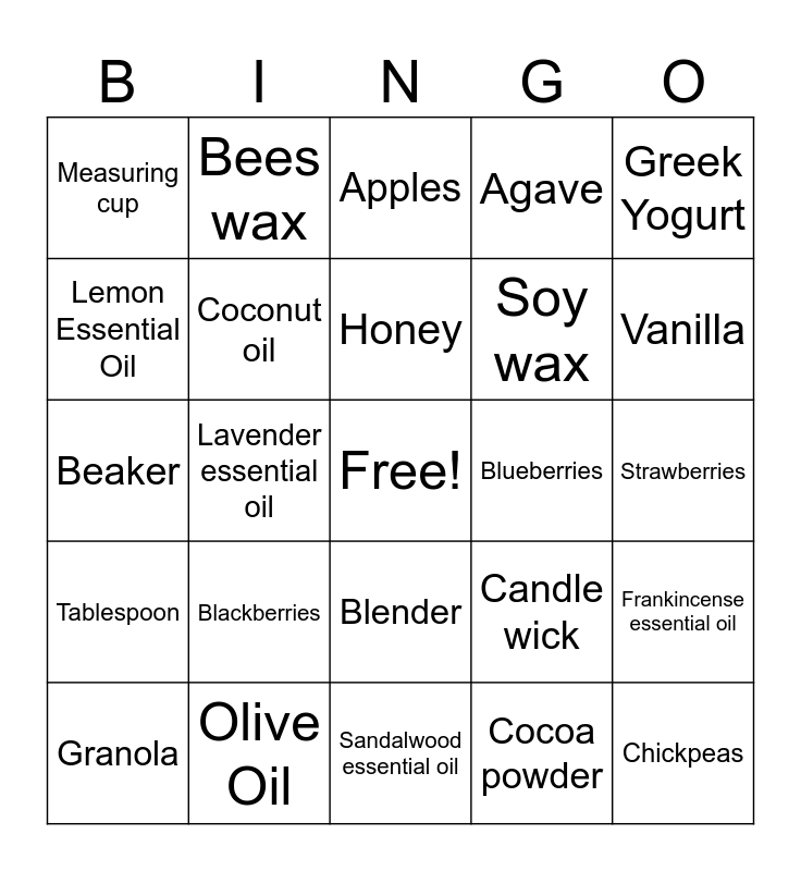 This bingo card has a free space and 24 words: Blackberries, Olive Oil, Honey, Granola, Greek Yogurt, Measuring cup, Lemon Essential Oil, Bees wax, Blueberries, Blender, Soy wax, Beaker, Candle wick, Frankincense essential oil, Coconut oil, Cocoa powder, Strawberries, Apples, Vanilla, Lavender essential oil, Chickpeas, Tablespoon, Agave and Sandalwood essential oil.