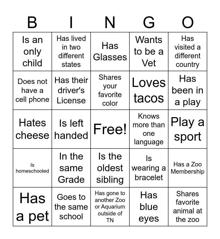 This bingo card has a free space and 24 words: In the same Grade, Goes to the same school, Shares your favorite color, Has a pet, Has visited a different country, Is an only child, Does not have a cell phone, Has lived in two different states, Knows more than one language, Is the oldest sibling, Loves tacos, Hates cheese, Is wearing a bracelet, Has a Zoo Membership, Has their driver's License, Has blue eyes, Play a sport, Has Glasses, Has been in a play, Is left handed, Shares favorite animal at the zoo, Is homeschooled, Wants to be a Vet and Has gone to another Zoo or Aquarium outside of TN.