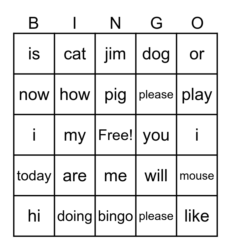 This bingo card has a free space and 29 words: hi, there, my, name, is, jim, how, are, you, doing, i, like, bingo, please, play, with, me, today, or, i, will, cry, please, now, dog, cat, mouse, pig and horse.