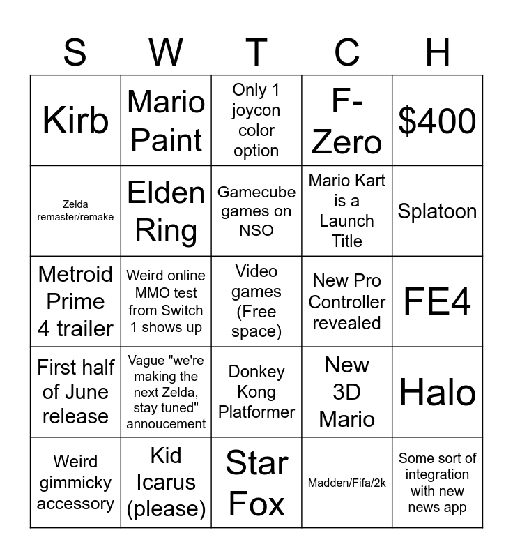 This bingo card has a free space and 24 words: Vague "we're making the next Zelda, stay tuned" annoucement, Kid Icarus (please), Gamecube games on NSO, Weird gimmicky accessory, $400, Kirb, Zelda remaster/remake, Mario Paint, New Pro Controller revealed, Donkey Kong Platformer, Mario Kart is a Launch Title, Metroid Prime 4 trailer, New 3D Mario, Halo, Elden Ring, Madden/Fifa/2k, FE4, Only 1 joycon color option, Splatoon, Weird online MMO test from Switch 1 shows up, Some sort of integration with new news app, First half of June release, F-Zero and Star Fox.
