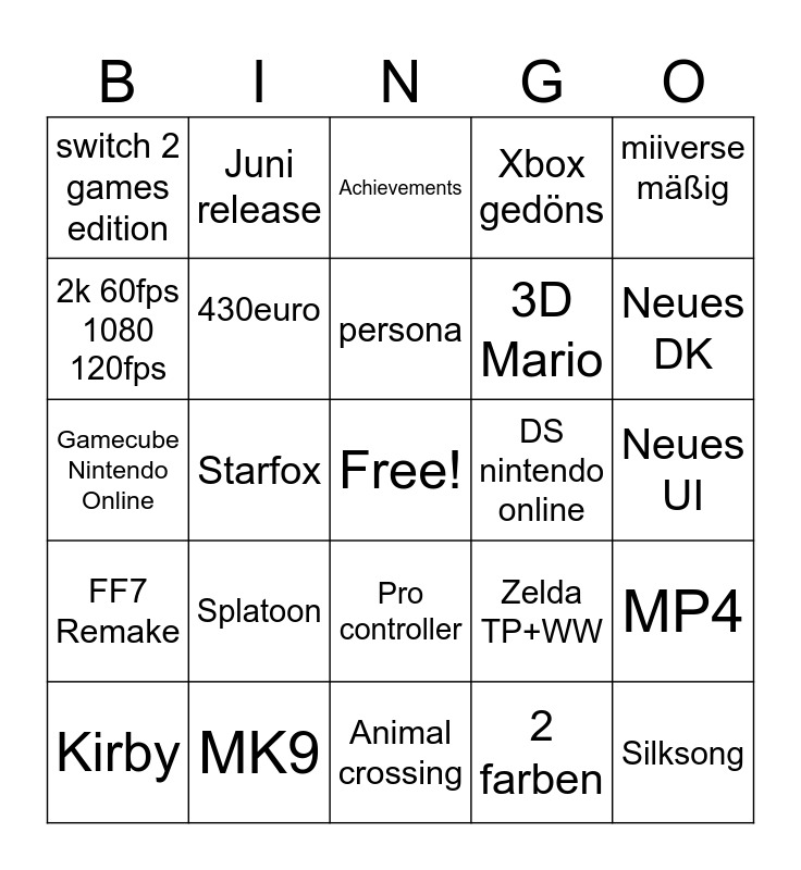 This bingo card has a free space and 24 words: Splatoon, MK9, persona, Kirby, miiverse mäßig, switch 2 games edition, 2k 60fps 1080 120fps, Juni release, DS nintendo online, Pro controller, 3D Mario, Gamecube Nintendo Online, Zelda TP+WW, MP4, 430euro, 2 farben, Neues UI, Achievements, Neues DK, Starfox, Silksong, FF7 Remake, Xbox gedöns and Animal crossing.