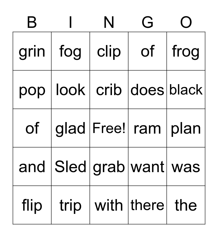 This bingo card has a free space and 24 words: Sled, trip, crib, flip, frog, grin, pop, fog, ram, grab, does, of, want, was, look, there, plan, clip, black, glad, the, and, of and with.