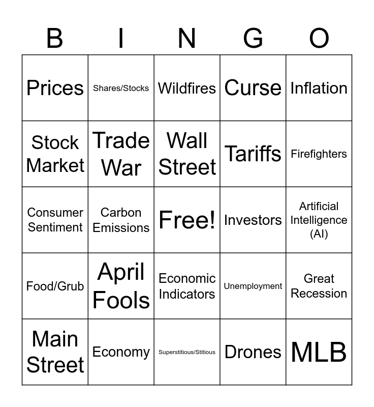 This bingo card has a free space and 24 words: April Fools, Economy, Wall Street, Main Street, Inflation, Prices, Stock Market, Shares/Stocks, Investors, Economic Indicators, Tariffs, Consumer Sentiment, Unemployment, Great Recession, Trade War, Drones, Artificial Intelligence (AI), Wildfires, Firefighters, Carbon Emissions, MLB, Food/Grub, Curse and Superstitious/Stitious.