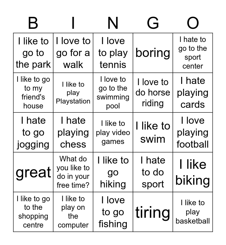 This bingo card has 25 words: What do you like to do in your free time?, I love to go fishing, I love to go to the swimming pool, I like to go to the shopping centre, I hate to go to the sport center, I like to go to the park, I like to go to my friend's house, I love to go for a walk, I like to swim, I like to go hiking, I love to do horse riding, I hate to go jogging, I hate to do sport, I like biking, I like to play Playstation, I like to play basketball, I love playing football, I love to play tennis, I hate playing cards, I hate playing chess, I like to play video games, I like to play on the computer, great, boring and tiring.