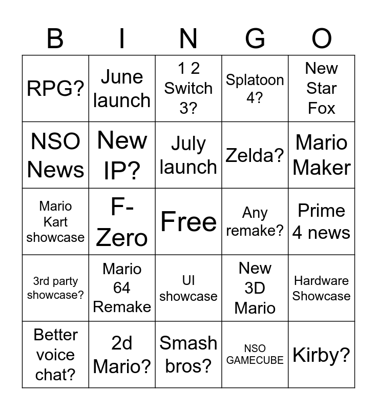 This bingo card has a free space and 24 words: Mario 64 Remake, 2d Mario?, July launch, Better voice chat?, New Star Fox, RPG?, NSO News, June launch, Any remake?, UI showcase, Zelda?, Mario Kart showcase, New 3D Mario, Hardware Showcase, New IP?, NSO GAMECUBE, Prime 4 news, 1 2 Switch 3?, Mario Maker, F-Zero, Kirby?, 3rd party showcase?, Splatoon 4? and Smash bros?.
