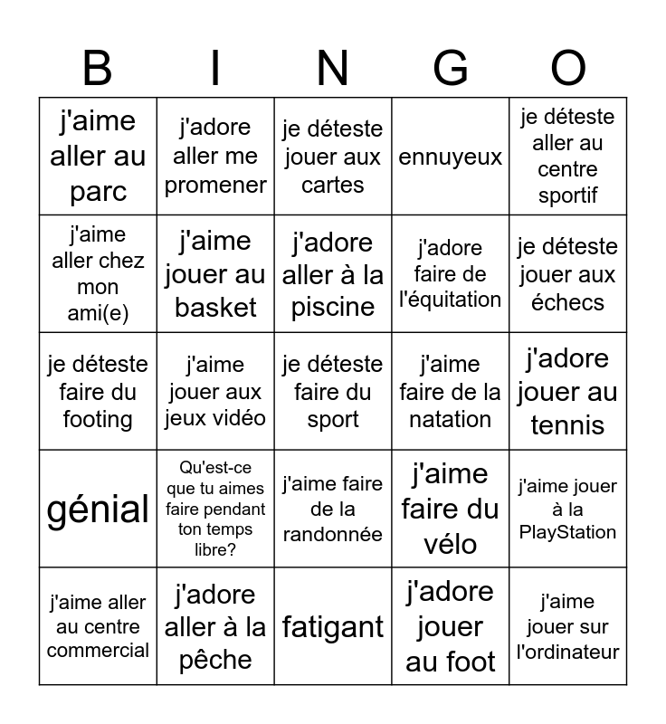 This bingo card has a free space and 24 words: Qu'est-ce que tu aimes faire pendant ton temps libre?, j'adore aller à la pêche, j'adore aller à la piscine, j'aime aller au centre commercial, je déteste aller au centre sportif, j'aime aller au parc, j'aime aller chez mon ami(e), j'adore aller me promener, j'aime faire de la natation, j'aime faire de la randonnée, j'adore faire de l'équitation, je déteste faire du footing, j'aime faire du vélo, j'aime jouer à la PlayStation, j'aime jouer au basket, j'adore jouer au foot, j'adore jouer au tennis, je déteste jouer aux cartes, je déteste jouer aux échecs, j'aime jouer aux jeux vidéo, j'aime jouer sur l'ordinateur, génial, ennuyeux and fatigant.