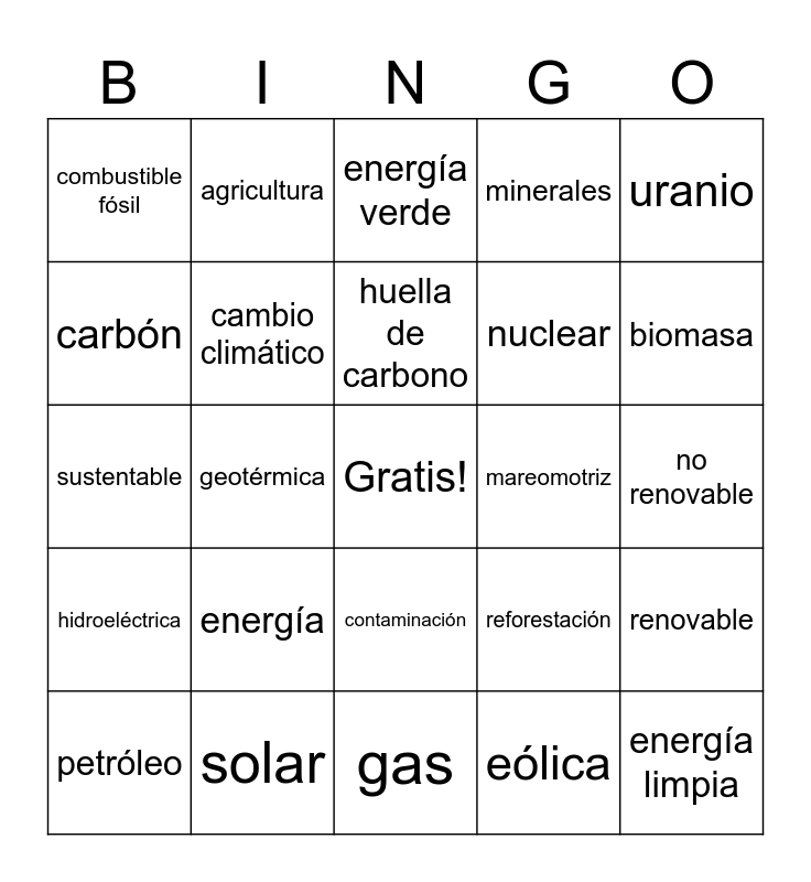This bingo card has a free space and 24 words: energía, solar, huella de carbono, petróleo, uranio, combustible fósil, carbón, agricultura, mareomotriz, contaminación, nuclear, sustentable, reforestación, renovable, cambio climático, eólica, no renovable, energía verde, biomasa, geotérmica, energía limpia, hidroeléctrica, minerales and gas.