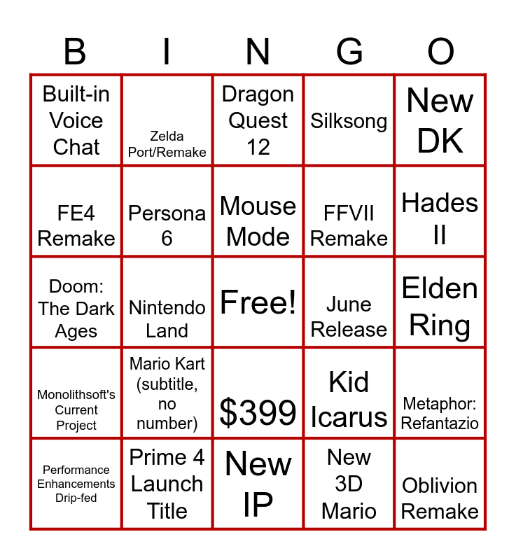 This bingo card has a free space and 24 words: Mario Kart (subtitle, no number), Prime 4 Launch Title, Mouse Mode, Performance Enhancements Drip-fed, New DK, Built-in Voice Chat, FE4 Remake, Zelda Port/Remake, June Release, $399, FFVII Remake, Doom: The Dark Ages, Kid Icarus, Metaphor: Refantazio, Persona 6, New 3D Mario, Elden Ring, Dragon Quest 12, Hades II, Nintendo Land, Oblivion Remake, Monolithsoft's Current Project, Silksong and New IP.
