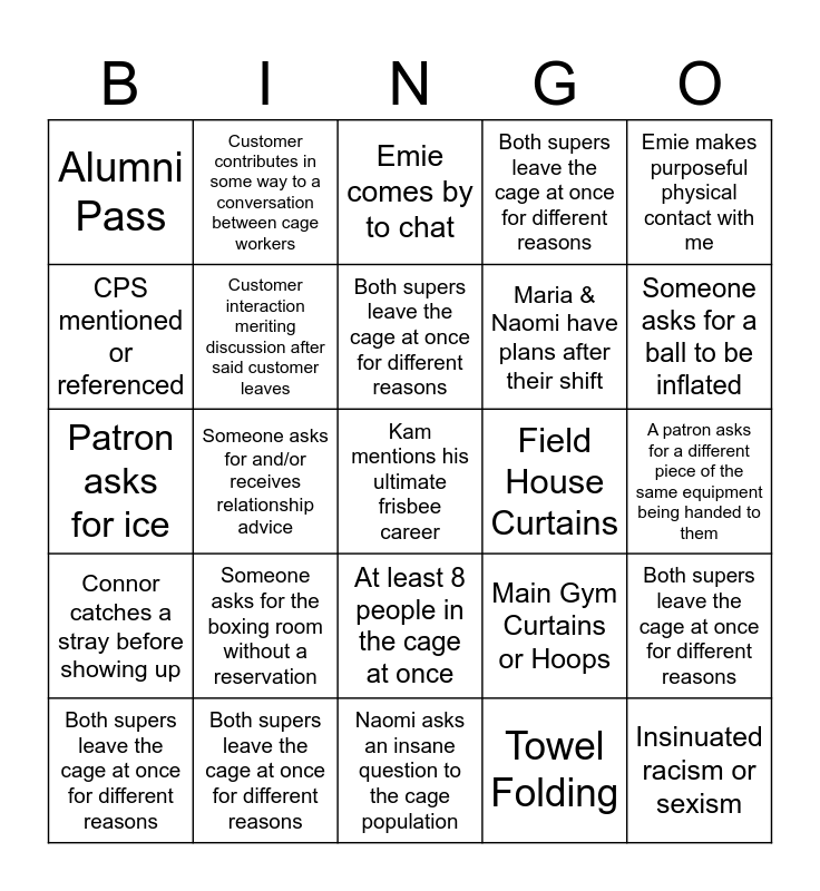 This bingo card has 30 words: Both supers leave the cage at once for different reasons, Maria makes someone else do her job for her, Someone asks for and/or receives relationship advice, Sam Kam and Brendan talk sports, Alumni Pass, Emie comes by to chat, Customer interaction meriting discussion after said customer leaves, At least 8 people in the cage at once, Field House Curtains, Naomi asks an insane question to the cage population, A patron asks for a different piece of the same equipment being handed to them, Kam mentions his ultimate frisbee career, Towel Folding, Insinuated racism or sexism, Someone asks for a ball to be inflated, Naomi shows someone a picture or video, Main Gym Curtains or Hoops, Connor catches a stray before showing up, Someone asks for the boxing room without a reservation, Emie makes purposeful physical contact with me, Patron asks for ice, Lord Farquaad reference made towards / about Jeff, Customer contributes in some way to a conversation between cage workers, Maria & Naomi have plans after their shift, CPS mentioned or referenced, Both supers leave the cage at once for different reasons, Both supers leave the cage at once for different reasons, Both supers leave the cage at once for different reasons, Both supers leave the cage at once for different reasons and Both supers leave the cage at once for different reasons.