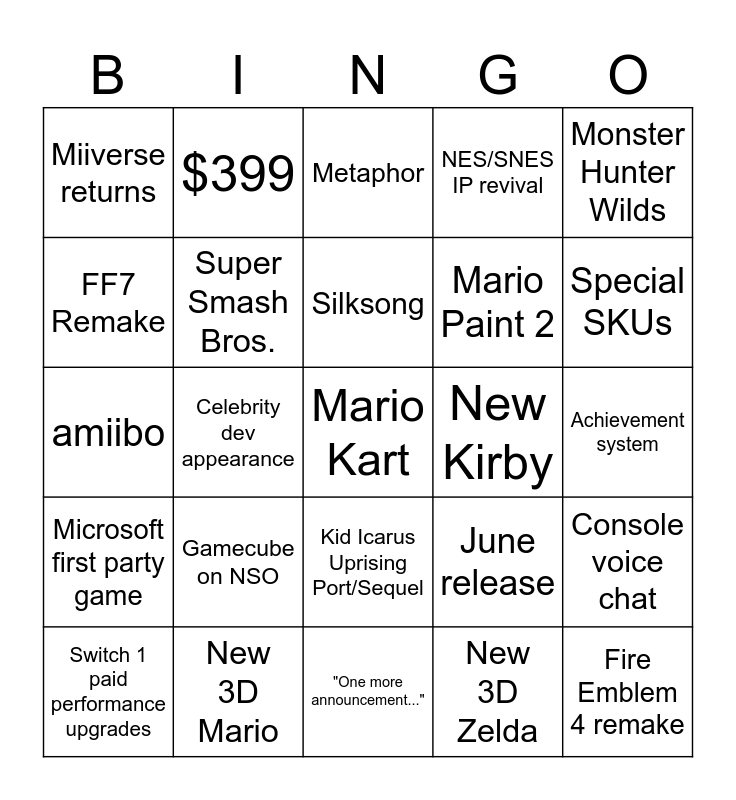 This bingo card has a free space and 24 words: Gamecube on NSO, New 3D Mario, Silksong, Switch 1 paid performance upgrades, Monster Hunter Wilds, Miiverse returns, FF7 Remake, $399, New Kirby, Kid Icarus Uprising Port/Sequel, Mario Paint 2, amiibo, June release, Console voice chat, Super Smash Bros., New 3D Zelda, Achievement system, Metaphor, Special SKUs, Celebrity dev appearance, Fire Emblem 4 remake, Microsoft first party game, NES/SNES IP revival and "One more announcement...".