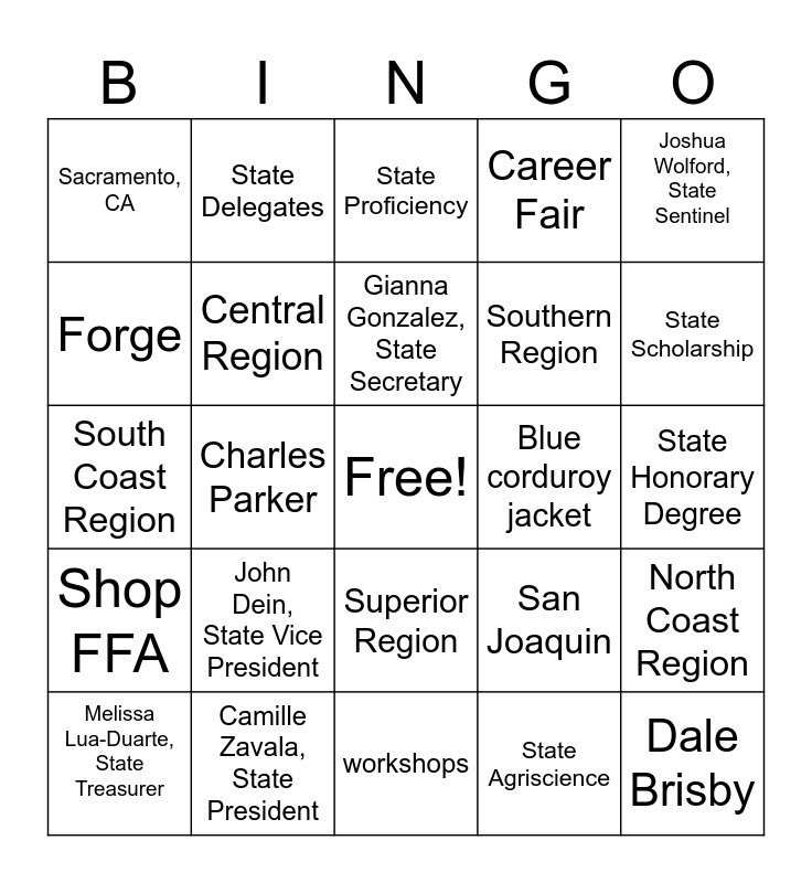 This bingo card has a free space and 24 words: John Dein, State Vice President, Camille Zavala, State President, Gianna Gonzalez, State Secretary, Melissa Lua-Duarte, State Treasurer, Joshua Wolford, State Sentinel, Sacramento, CA, Forge, State Delegates, Blue corduroy jacket, Superior Region, Southern Region, South Coast Region, San Joaquin, North Coast Region, Central Region, State Agriscience, State Honorary Degree, State Proficiency, State Scholarship, Charles Parker, Dale Brisby, Shop FFA, Career Fair and workshops.