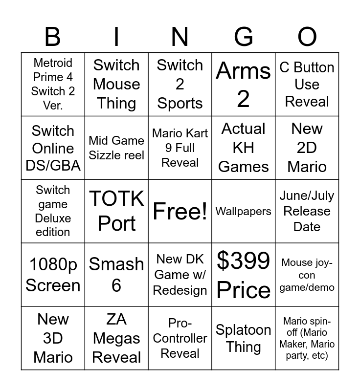 This bingo card has a free space and 24 words: New 3D Mario, Smash 6, Mario Kart 9 Full Reveal, Splatoon Thing, C Button Use Reveal, Metroid Prime 4 Switch 2 Ver., Switch Mouse Thing, Switch 2 Sports, Wallpapers, June/July Release Date, Switch game Deluxe edition, Mid Game Sizzle reel, $399 Price, Mouse joy-con game/demo, Switch Online DS/GBA, ZA Megas Reveal, Pro-Controller Reveal, Arms 2, New 2D Mario, 1080p Screen, TOTK Port, New DK Game w/ Redesign, Actual KH Games and Mario spin-off (Mario Maker, Mario party, etc).