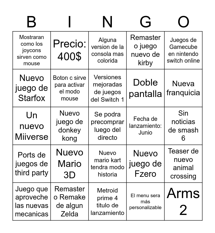 This bingo card has a free space and 24 words: Nuevo Mario 3D, Remaster o Remake de algun Zelda, Versiones mejoradas de juegos del Switch 1, Juego que aproveche las nuevas mecanicas, Juegos de Gamecube en nintendo switch online, Mostraran como los joycons sirven como mouse, Nuevo juego de Starfox, Precio: 400$, Fecha de lanzamiento: Junio, Nuevo mario kart tendra modo historia, Doble pantalla, Un nuevo Miiverse, Nuevo juego de Fzero, Teaser de nuevo animal crossing, Boton c sirve para activar el modo mouse, El menu sera más personalizable, Sin noticias de smash 6, Alguna version de la consola mas colorida, Nueva franquicia, Nuevo juego de donkey kong, Arms 2, Ports de juegos de third party, Remaster o juego nuevo de kirby and Metroid prime 4 titulo de lanzamiento.