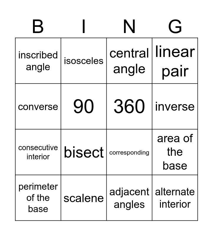 This bingo card has 22 words: scalene, equilateral, isosceles, 180, 90, 360, inscribed angle, central angle, corresponding, alternate interior, consecutive interior, linear pair, vertical angles, supplementary angles, adjacent angles, complementary angles, area of the base, perimeter of the base, bisect, converse, inverse and contrapositive.
