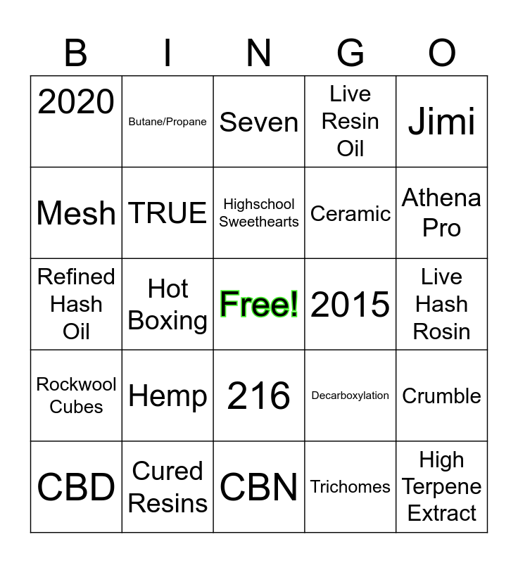 This bingo card has a free space and 29 words: CBD, Colorado, Hot Boxing, Limonene, 2020, Seven, TRUE, Hemp, 2015, Cured Resins, Live Hash Rosin, High Terpene Extract, CBN, Trichomes, Athena Pro, Eight, 216, Rockwool Cubes, Jimi, Refined Hash Oil, Decarboxylation, Fresh Frozen, Ceramic, Mesh, Live Resin Oil, Butane/Propane, Crumble, Highschool Sweethearts and Nine.