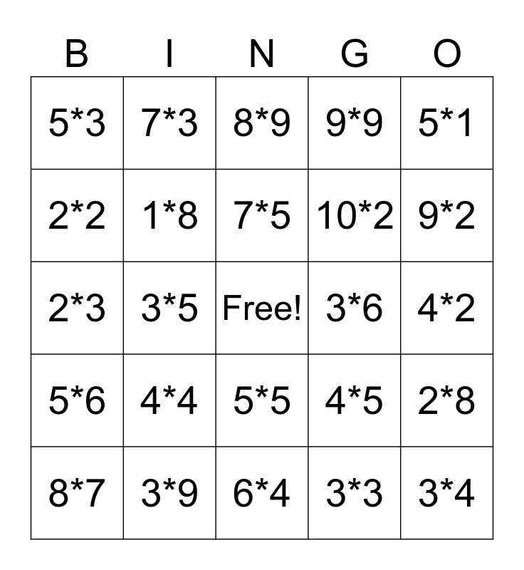 This bingo card has a free space and 24 words: 4*4, 3*9, 7*5, 8*7, 5*1, 5*3, 2*2, 7*3, 3*6, 5*5, 10*2, 2*3, 4*5, 2*8, 1*8, 3*3, 4*2, 8*9, 9*2, 3*5, 3*4, 5*6, 9*9 and 6*4.