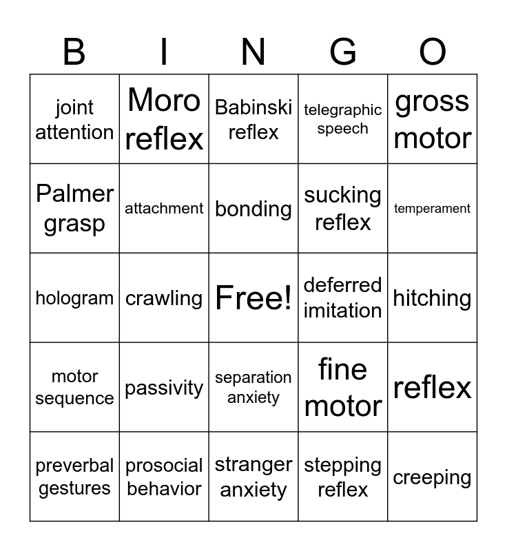 This bingo card has a free space and 28 words: reflex, rooting reflex, sucking reflex, stepping reflex, Palmer grasp, Babinski reflex, Moro reflex, motor sequence, deferred imitation, preverbal gestures, hologram, telegraphic speech, prosocial behavior, stranger anxiety, temperament, overstimulation/ overstimulated, passivity, attachment, bonding, separation anxiety, joint attention, object permanence, creeping, crawling, hitching, fine motor, gross motor and irritability.