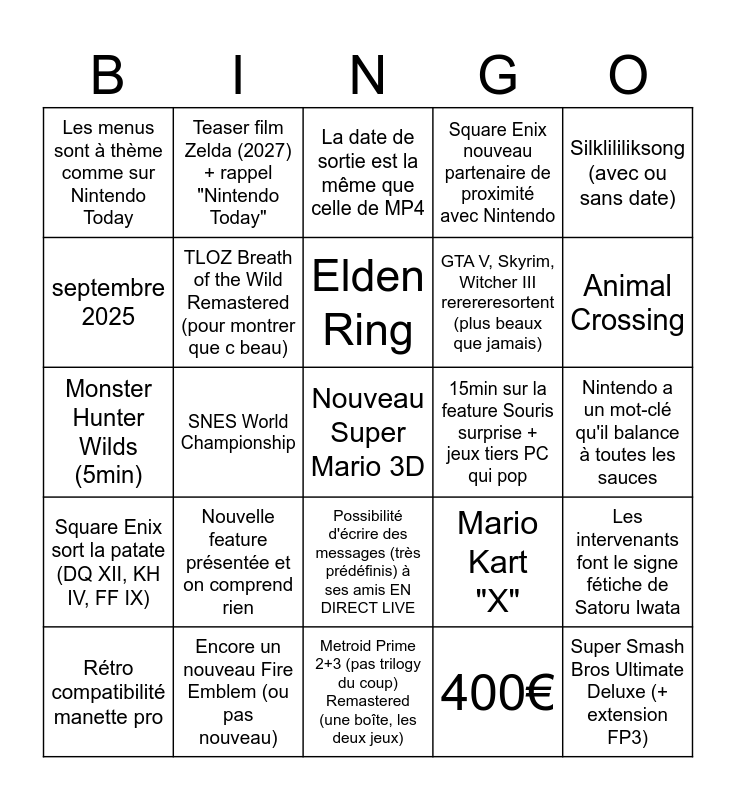 This bingo card has a free space and 24 words: Nouvelle feature présentée et on comprend rien, Encore un nouveau Fire Emblem (ou pas nouveau), Elden Ring, Rétro compatibilité manette pro, Silklililiksong (avec ou sans date), Les menus sont à thème comme sur Nintendo Today, septembre 2025, Teaser film Zelda (2027) + rappel "Nintendo Today", 15min sur la feature Souris surprise + jeux tiers PC qui pop, Possibilité d'écrire des messages (très prédéfinis) à ses amis EN DIRECT LIVE, GTA V, Skyrim, Witcher III rerereresortent (plus beaux que jamais), Monster Hunter Wilds (5min), Mario Kart "X", Les intervenants font le signe fétiche de Satoru Iwata, TLOZ Breath of the Wild Remastered (pour montrer que c beau), 400€, Nintendo a un mot-clé qu'il balance à toutes les sauces, La date de sortie est la même que celle de MP4, Animal Crossing, SNES World Championship, Super Smash Bros Ultimate Deluxe (+ extension FP3), Square Enix sort la patate (DQ XII, KH IV, FF IX), Square Enix nouveau partenaire de proximité avec Nintendo and Metroid Prime 2+3 (pas trilogy du coup) Remastered (une boîte, les deux jeux).