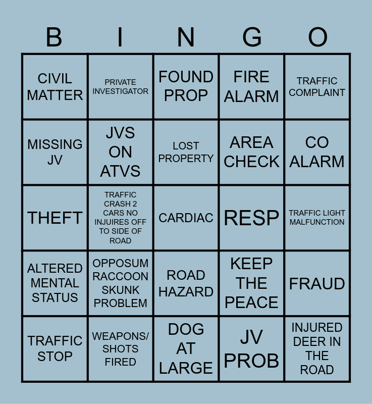 This bingo card has 55 words: MEDICAL ALARM, TRAFFIC STOP, DOMESTIC, CIVIL MATTER, DOG AT LARGE, LOUD MUSIC, JVS ON ATVS, 911 HANG UP, AREA CHECK, BURG ALARM, FIRE ALARM, WELLFARE CHECK, PESS SCREANING, GENERAL WEAKNESS, ASSIST LIFT, ASSIST OTHER AGENCY, TRAFFIC COMPLAINT, TRAFFIC CRASH 2 CARS NO INJUIRES OFF TO SIDE OF ROAD, TRAFFIC CRASH WITH POLE/WIRES DOWN, CARDIAC, RESP, SUSP AUTO, KEEP THE PEACE, FOUND PROP, DISORDERLY IN PROGRESS, LOST PROPERTY, JV PROB, LOW HANGING WIRES, TRAFFIC LIGHT MALFUNCTION, FRAUD, SUSP PERSON, MUT AID EMS, ERRATIC DRIVER, MISSING ADULT, MISSING JV, THEFT, ABDOMINAL PAIN, ALTERED MENTAL STATUS, INJURED DEER IN THE ROAD, DEAD DEER ON PRIVATE PROP, PRIVATE INVESTIGATOR, HARASSMENT, WELLFARE CHECK TURNED DOA, CPR IN PROGRESS WHILE ON THE PHONE, OPPOSUM RACCOON SKUNK PROBLEM, WEAPONS/ SHOTS FIRED, UNRESPONSIVE, WATER MAIN BREAK, DISABLED VEH, CO ALARM, WATER LEAK, STROKE/ CVA, CRASH CAR INTO BUILDING, ROAD HAZARD and SUICIDAL PERSON.