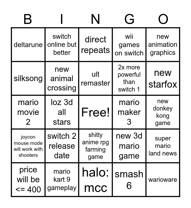 This bingo card has a free space and 24 words: switch 2 release date, mario kart 9 gameplay, ult remaster, price will be <= 400, new animation graphics, deltarune, silksong, switch online but better, mario maker 3, shitty anime rpg farming game, 2x more powerful than switch 1, mario movie 2, new 3d mario game, super mario land news, new animal crossing, smash 6, new donkey kong game, direct repeats, new starfox, loz 3d all stars, warioware, joycon mouse mode will work with shooters, wii games on switch and halo: mcc.