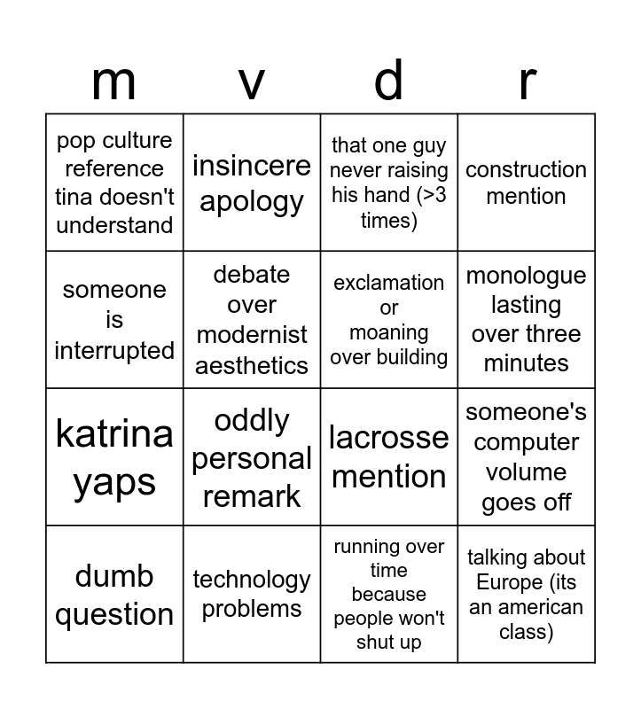 This bingo card has 16 words: technology problems, someone's computer volume goes off, that one guy never raising his hand (>3 times), pop culture reference tina doesn't understand, katrina yaps, insincere apology, lacrosse mention, running over time because people won't shut up, someone is interrupted, debate over modernist aesthetics, dumb question, construction mention, oddly personal remark, monologue lasting over three minutes, exclamation or moaning over building and talking about Europe (its an american class).