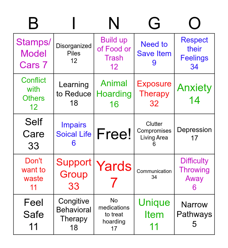 This bingo card has a free space and 24 words: Support Group 33, Congitive Behavioral Therapy 18, Animal Hoarding 16, Feel Safe 11, Respect their Feelings 34, Stamps/ Model Cars 7, Conflict with Others 12, Disorganized Piles 12, Clutter Compromises Living Area 6, Yards 7, Exposure Therapy 32, Self Care 33, Communication 34, Difficulty Throwing Away 6, Learning to Reduce 18, Unique Item 11, Depression 17, Build up of Food or Trash 12, Anxiety 14, Impairs Soical Life 6, Narrow Pathways 5, Don't want to waste 11, Need to Save Item 9 and No medications to treat hoarding 17.