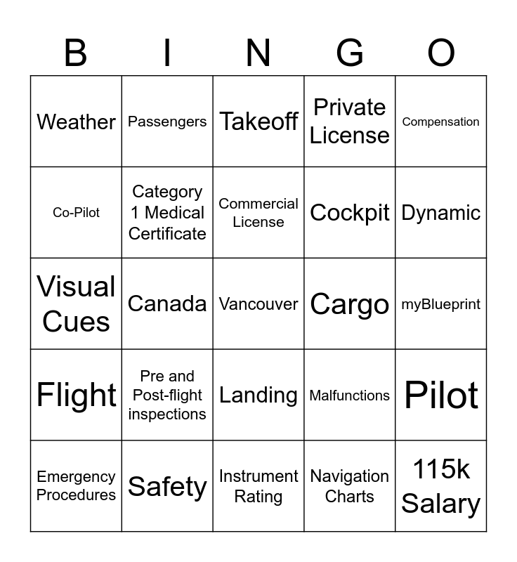 This bingo card has a free space and 28 words: Pilot, Aircraft, Cockpit, Navigation Charts, Co-Pilot, Takeoff, Passengers, Flight, Cargo, Emergency Procedures, Visual Cues, Private License, Safety, Instrument Rating, Dynamic, Airline Pilots, Pre and Post-flight inspections, Category 1 Medical Certificate, Commercial License, Landing, Weather, 200 hours, 115k Salary, Canada, myBlueprint, Malfunctions, Compensation and Pre flight briefing.