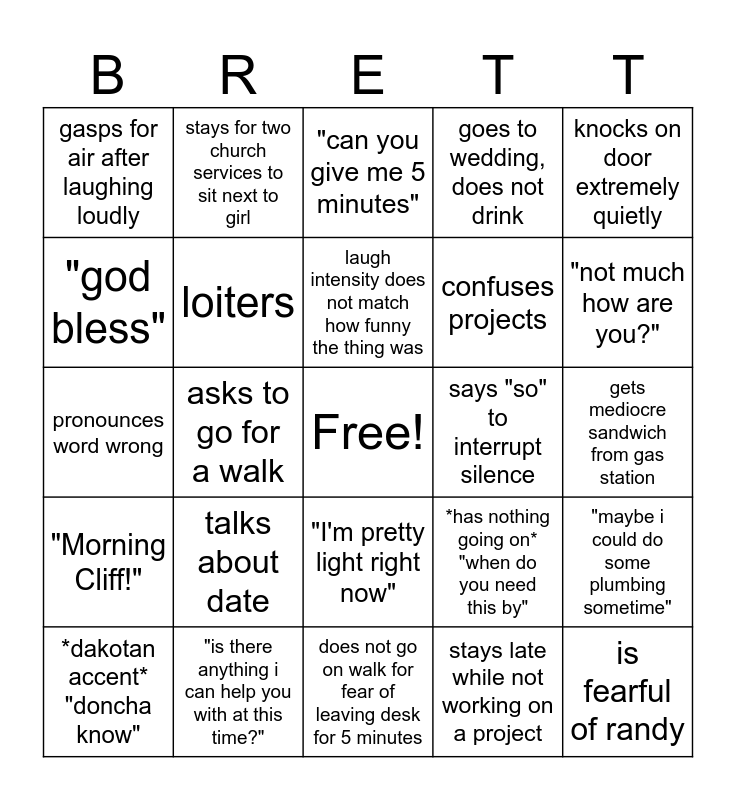 This bingo card has a free space and 29 words: *dakotan accent* "doncha know", *raises hand motioning to himself* "Hi!", asks to go for a walk, "let me know if something explodes on you", gasps for air after laughing loudly, "can you give me 5 minutes", loiters, talks about date, says "so" to interrupt silence, "is there anything i can help you with at this time?", gets mediocre sandwich from gas station, is fearful of randy, does not go on walk for fear of leaving desk for 5 minutes, stays late while not working on a project, "not much how are you?", "you surviving?", "I'm pretty light right now", "Morning Cliff!", knocks on door extremely quietly, pronounces word wrong, *has nothing going on* "when do you need this by", gets kidney stone, confuses projects, "god bless", goes to wedding, does not drink, stays for two church services to sit next to girl, "maybe i could do some plumbing sometime", laugh intensity does not match how funny the thing was and straight up forgets about helping with something.