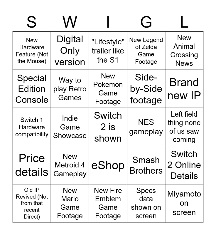 This bingo card has a free space and 24 words: New Metroid 4 Gameplay, New Mario Game Footage, New Pokemon Game Footage, Old IP Revived (Not from that recent Direct), New Animal Crossing News, New Hardware Feature (Not the Mouse), Special Edition Console, Digital Only version, NES gameplay, eShop, Side-by-Side footage, Switch 1 Hardware compatibility, Smash Brothers, Switch 2 Online Details, Way to play Retro Games, Specs data shown on screen, Left field thing none of us saw coming, "Lifestyle" trailer like the S1, Brand new IP, Indie Game Showcase, Miyamoto on screen, Price details, New Legend of Zelda Game Footage and New Fire Emblem Game Footage.
