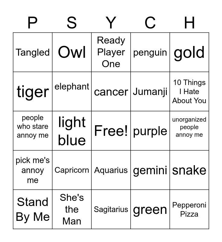 This bingo card has a free space and 51 words: Cheese Pizza, Pepperoni Pizza, Sausage Pizza, Sagitarius, Capricorn, Giraffe, Owl, lion, tiger, bear, elephant, penguin, snake, gemini, pisces, taurus, cancer, purple, pink, gold, light blue, green, Tangled, Jumanji, The Incredibles, The Notebook, 10 Things I Hate About You, Shrek, Stand By Me, Ready Player One, The Night Before Christmas, The Conjuring, 500 Days of Summer, Rio, Batman, She's the Man, People who talk to me when I have headphones in annoy me, Loud chewers annoy me, people with no manner annoy me, messy people annoy me, unorganized people annoy me, pick me's annoy me, eating with mouth open annoys me, being ignored annoys me, stupid comments annoys me, confusing people's names annoys me, people who stare annoy me, people who complain annoy me, Good Will Hunting, Aquarius and Veggie Pizza.