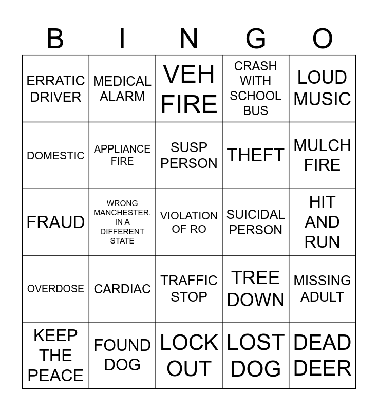 This bingo card has 40 words: CAR VS DEER, FRAUD, CAR VS BUILDING, APPLIANCE FIRE, FOUND DOG, TRAFFIC STOP, SUSP PERSON, CARS GOING INTO SARCO, LOUD MUSIC, OVERDOSE, WRONG MANCHESTER, IN A DIFFERENT STATE, CRASH WITH SCHOOL BUS, VIOLATION OF RO, HIT AND RUN, SUICIDAL PERSON, CARDIAC, ASSIST LIFT, ERRATIC DRIVER, TRAFFIC LIGHT MALFUNCTION, VEH FIRE, MISSING ADULT, LOST DOG, THEFT, DOMESTIC, CRIM MISS, MVA W/MORE THAN 3 CARS, MVA W/ OVERTURN OR ENTRAPMENT, ATVS ON THE ROAD, DEAD DEER, BARKING DOG, WELL CHECK, KEEP THE PEACE, VEH THEFT, TREE DOWN, MULCH FIRE, LOCK OUT, GAS LEAK, DOG BITE, MEDICAL ALARM and EMS MUT AID.