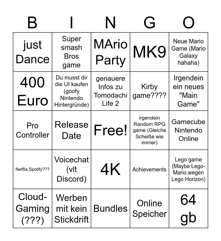 This bingo card has a free space and 24 words: Voicechat (vlt Discord), Werben mit kein Stickdrift, genauere Infos zu Tomodachi Life 2, Cloud-Gaming (???), Neue Mario Game (Mario Galaxy hahaha), just Dance, 400 Euro, Super smash Bros game, irgendein Random RPG game (Gleiche Scheiße wie immer), 4K, Kirby game????, Pro Controller, Achievements, Lego game (Maybe Lego-Mario,wegen Lego Horizon), Du musst dir die UI kaufen (goofy Nintendo Hintergründe), Online Speicher, Gamecube Nintendo Online, MArio Party, Irgendein ein neues "Main Game", Release Date, 64 gb, Netflix,Spotify???, MK9 and Bundles.